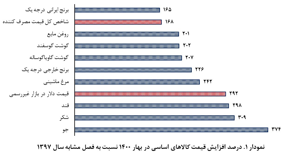 اکنون و با گذشت بیش از سه سال از اجرای این سیاست، میتوان قضاوت روشنی در مورد اثربخشی اجرای آن داشت. هدف اصلی این سیاست، کنترل افزایش قیمتها بوده است. نمودار ۱ درصد تغییرات کالاهای اساسی در بهار سال ۱۴۰۰ نسبت به بهار سال ۱۳۹۷ را نشان میدهد.