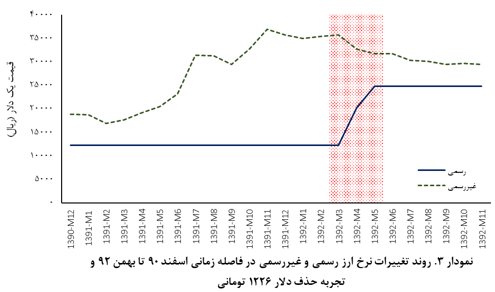 سیاست تثبیت نرخ رز در دوره تحریم های سال ۱۳۹۰ و ۱۳۹۱ نیز اجرا شد. در آن دوره ارز ۱۲۲۶ به منظور تامین کالاهای اساسی تعیین شد، اما این سیاست در آن دوره نیز به اهداف خود نرسید، ضمن این که منجر به واردات بیش از نیاز کالا به کشور شد. با این وجود در زمانی که دولت تصمیم به حذف تخصیص ارز ۱۲۲۶ گرفت، نرخ ارز در بازار آزاد نیز روند کاهشی به خود گرفته و در نهایت یکسان سازی نرخ ارز در سالهای بعد از آن انجام شد (نمودار ۳). بنابراین انتظار میرود که در صورت مدیریت صحیح، حذف ارز ۴۲۰۰، شوک جدیدی به بازار نرخ ارز وارد نکرده و نوسانات در این بازار معنی دار نشود.