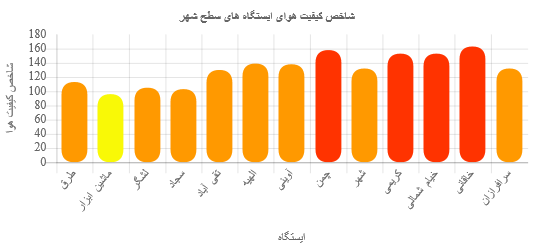 همانطور که مشاهده میکنید، تنها منطقه دارای کیفیت هوای قابل قبول در شهر ایستگاه ماشین ابزار است و چهار منطقه خاقانی، خیام شمالی، کریمی و چمن در وضعیت قرمز به سر میبرند.