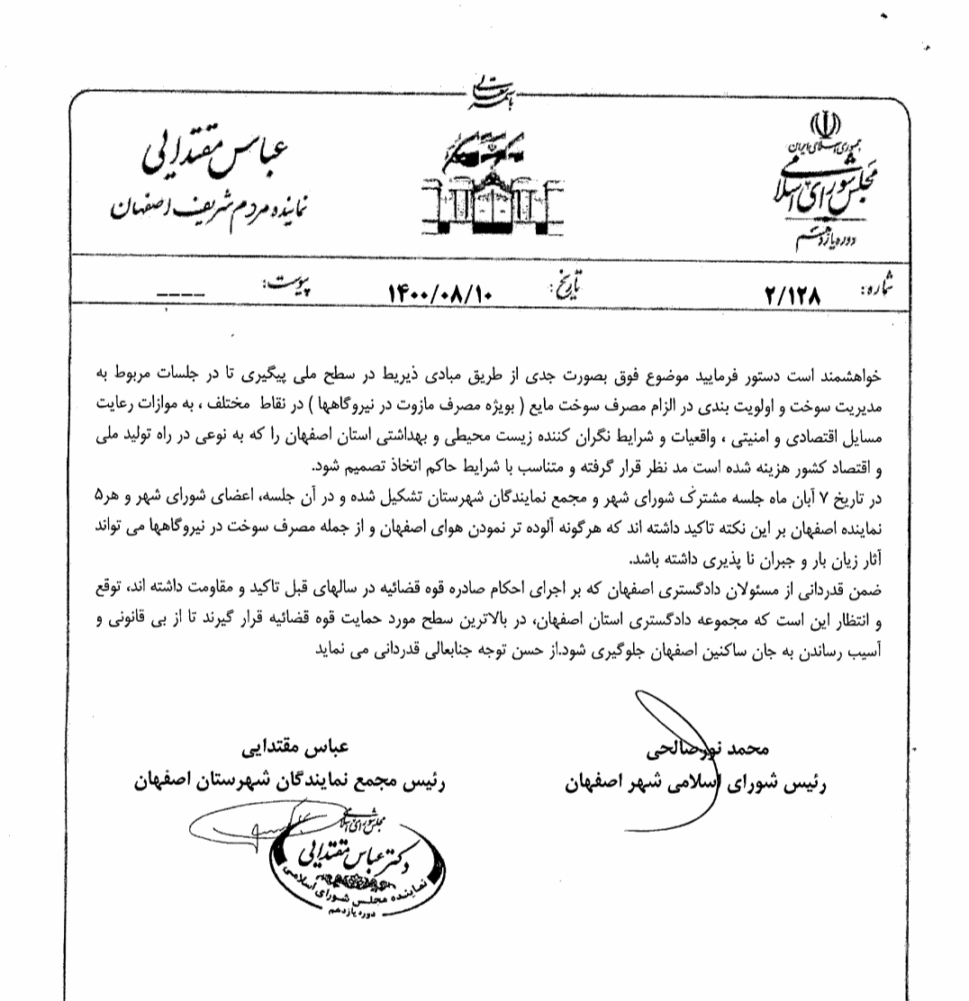 در پایان عنوان شده است: در تاریخ ۷ آبان ماه جلسه مشترک شورای شهر و مجمع نمایندگان شهرستان تشکیل شده و در آن جلسه، اعضای شورای شهر و هر ۵ نماینده اصفهان بر این نکته تاکید داشتهاند که هرگونه آلوده تر کردن هوای اصفهان و از جمله مصرف سوخت در نیروگاهها میتواند آثار زیانبار و جبرانناپذیری داشته باشد.