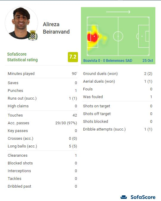 در این بازی علیرضا بیرانوند دروازه بان تیم ملی کشورمان در این بازی از ابتدا در ترکیب بواویشتا حضور داشت و ۹۰ دقیقه بازی کرد.
