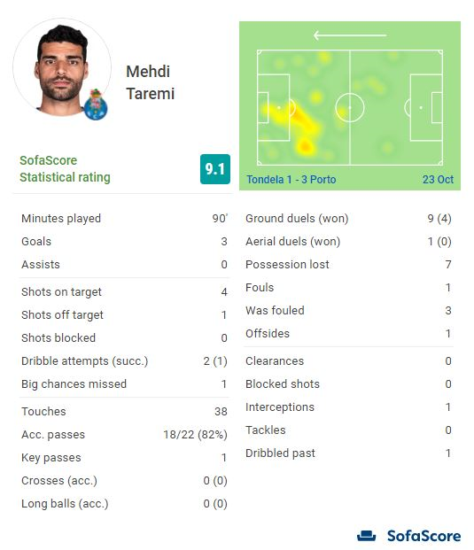 با نگاه به آمار طارمی در این بازی متوجه می شوید این بازیکن چقدر در ترکیب پورتو تاثیرگذار بوده است. طارمی ۹۰ دقیقه برای تیمش بازی کرد. ۳ گل به ثمر رساند. پاس گلی ندارد. ۴ شوت به دروازه رقیب داشته که ۳ شوت به گل تبدیل شده است. این آمار نشان از دقت بالای ستاره ایرانی در شوت های هدفمند به چارچوب دروازه رقیب را نشان می دهد.