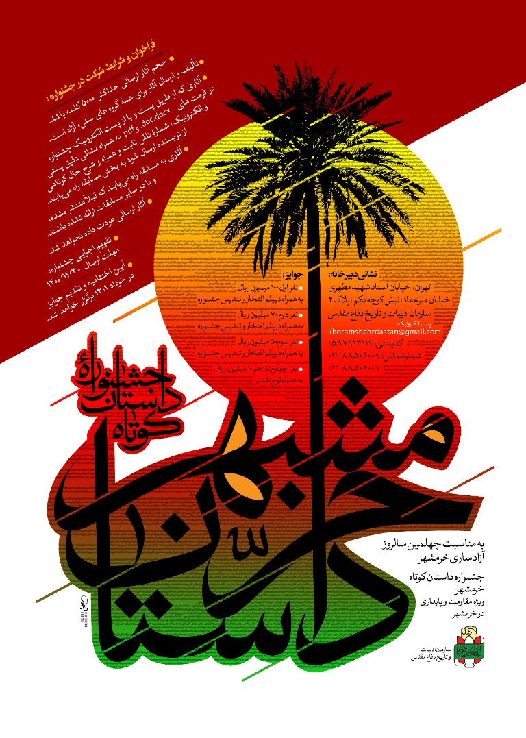 به گزارش خبرنگار حوزه کتاب و ادبیات برگزیده های ایران، جشنواره «داستان خرمشهر» به مناسبت چهلمین سالروز آزادسازی این شهر در دوران دفاع مقدس با رویکرد داستان کوتاه ویژه مقاومت و پایداری در خرمشهر برگزار میشود.