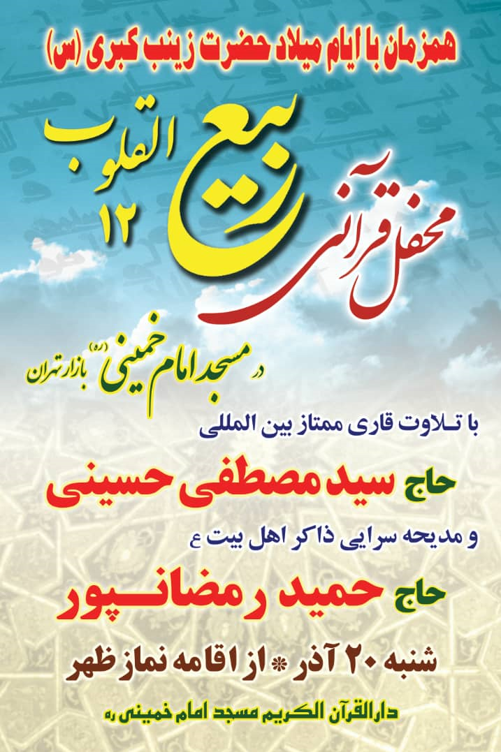 به گزارش خبرنگار قرآن و فعالیتهای دینی برگزیده های ایران دوازدهمین محفل قرآنی ربیعالقلوب با حضور سیدمصطفی حسینی قاری بینالمللی قرآن کریم در مسجد جامع امام خمینی (ره) بازار تهران برگزار میشود.
