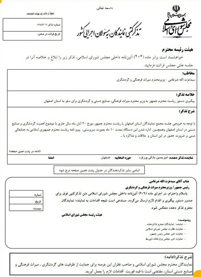 در متن این تذکر آمده است: با توجه به خروجی جلسه مجمع نمایندگان استان اصفهان با رییس جمهور مورخ ۲۰ آبان ماه سال جاری با موضوع اهمیت گردشگری و صنایع دستی در استان اصفهان وهمچنین اداره شدن این دستگاه به مدت ۱۰ ماه به صورت سرپرست و پیرو نامه ریاست جمهوری اسلامی به جنابعالی مبنی بر ضرورت حضور در این استان و ملاقات و مذاکره با نمایندگان مجلس شورای اسلامی و صاحبنظران این عرصه برای حمایت از ظرفیتهای گردشگری، میراث فرهنگی و صنایع دستی استان، مقتضی است با قید فوریت اقدامات لازم را به عمل آورید.