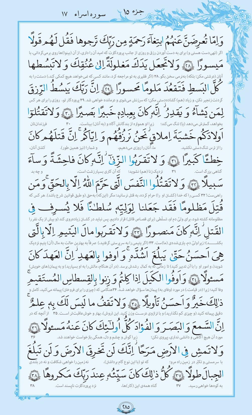 در ادامه تلاوت ترتیل صفحه ۲۸۵ قرآن کریم شامل آیات ۲۸ تا ۳۸ سوره مبارکه اسراء با صدای شهریار پرهیزکار تقدیم میشود.