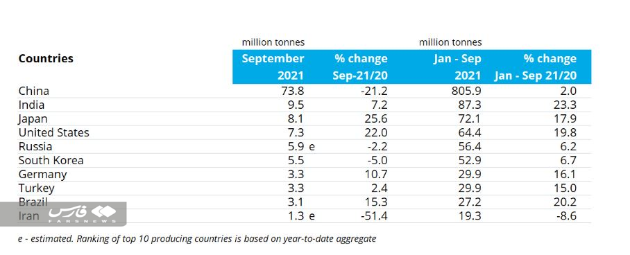 بر اساس این گزارش، تولید فولاد جهان در ماه سپتامبر ۲۰۲۱ نسبت به مدت مشابه سال گذشته ۸.۹ درصد کاهش یافته است و به ۱۴۴.۴ میلیون تن رسیده است.