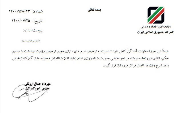 در این نامه معاون فنی گمرک آورده است: همانگونه که مستحضرید مدیرکل محترم امور دارو و مواد تحت کنترل سازمان غذا و دارو طی نامۀ شمارۀ ۲۷۵۰۳/۶۶۵ مورخ ۱۴۰۰.۵.۲۱ با توجه به کمبود سرم در کشور و نیاز مبرم بیماران و لزوم ترخیص فوری سرم های وارداتی، درخواست نمود ترخیص محموله های سرم به صورت حمل یکسره صورت پذیرد و تشریفات گمرکی مربوط به ترخیص کالاهای مذکور با بیجک دستی تسریع گردیده و مراتب، جهت خروج کالا از گمرک شهریار (تهران) به فوریت ابلاغ گردد که این موضوع بلافاصله به گمرکات بازرگان، تهران و فرودگاه امام خمینی (ره) ابلاغ و اجرایی گردید.