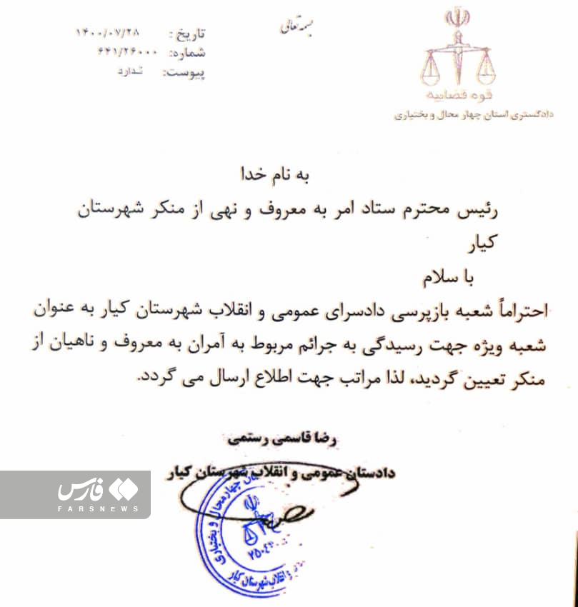 گفتنی است قبل از این، شعبه ویژه امر به معروف و نهی از منکر در دادسرای شهرکرد هم تعیین شده بود.