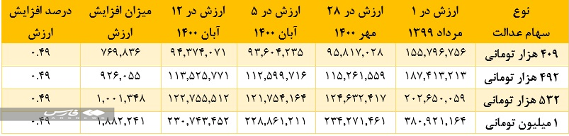 در هفته دوم آبان سهام عدالت با رشد ۰.۴۹ درصدی نسبت به هفته پیش از آن مواجه شده است. این مساله سبب شده است، سهام عدالت در برگه های مختلف به ترتیب با افزایش ۷۶ هزار و ۹۸۳ تومانی، ۹۲ هزار و ۰۵ تومانی، ۱۰۰ هزار تومانی و ۱۸۸ هزار تومانی مواجه شود.