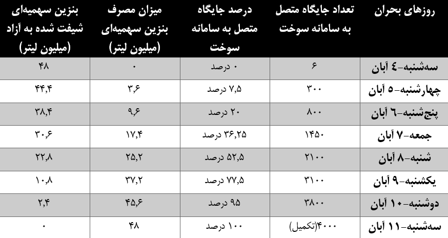از طرفی اعداد و ارقام مربوط به جایگاههایی که در روزهای مختلف از ۷ روز بحران به سامانه سوخت وصل شدهاند نیز در جدول ۱ آورده شده است؛ همچنین در این جدول محاسبه شده که با توجه به درصد جایگاههایی که در روزهای مختلف به سامانه هوشمند سوخت وصل شدهاند، به تفکیک هر روز چه میزان از سهم بنزین سهمیهای تحت تاثیر اختلال ایجاد شده به بنزین آزاد شیفت پیدا کرده است.