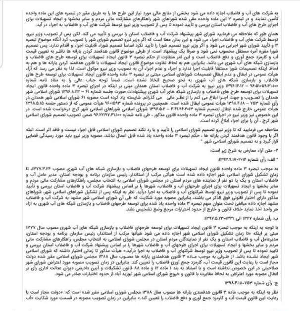 به گزارش برگزیده های ایران از مشهد، دیوان عدالت ادارای طی دادنامه ۱۷۱۹ مورخ چهاردهم بهمن ماه سال ۹۹، مصوبه ۹۳/۱۳۴۰۶ مورخ ۲۱ بهمن ماه سال ۹۳ شورای شهر(تحت عنوان تبصره۳ قانون ایجاد تسهیلات برای توسعه طرحهای فاضلاب) را که به شرکت آبفا اجازه میداد عوارضی را در فیشهای صادره شهروندان لحاظ کند، لغو کرد.