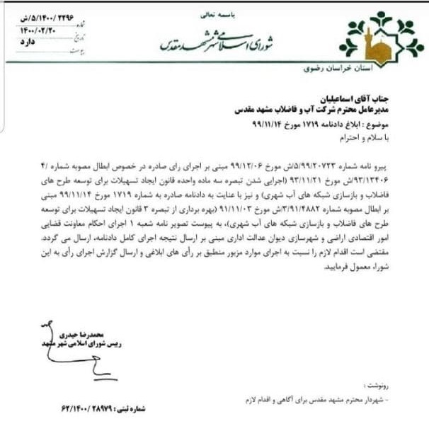 همچنین رئیس شورای شهر مشهد لغو مصوبه را (تبصره۳) طی نامه شماره «ش/۵/۱۴۰۰/۲۲۹۶» مورخ ۲۰ اردیبهشت ماه سال جاری به آب و فاضلاب را ابلاغ کرد.