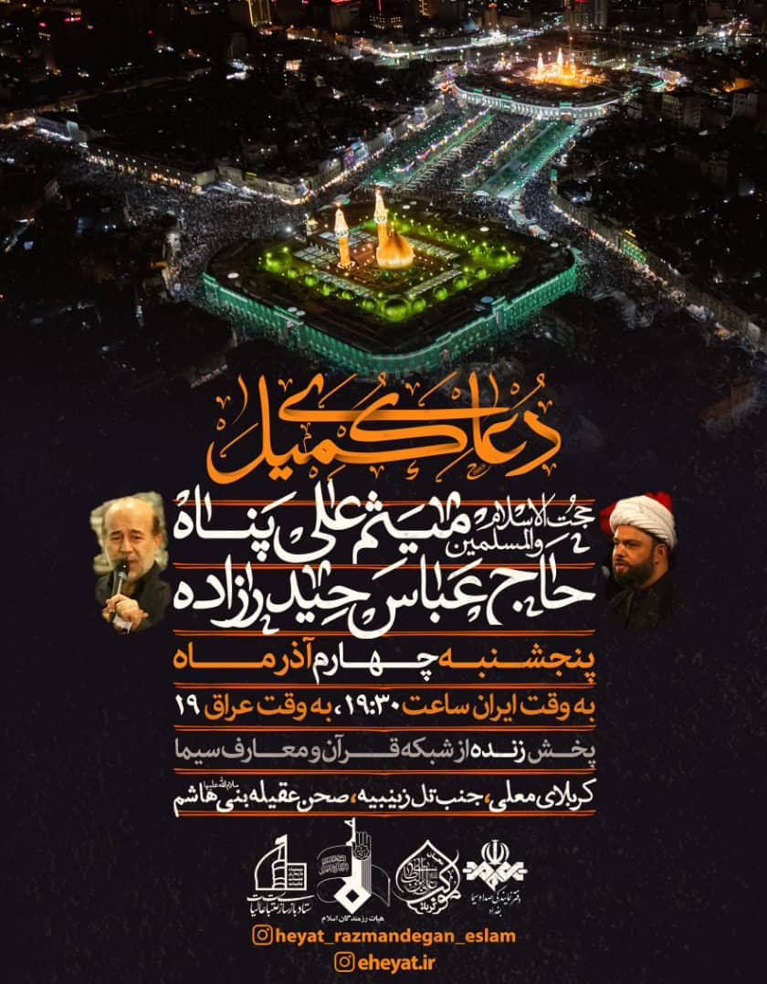 محل برگزاری دعای کمیل هیأت رزمندگان اسلام با مشارکت ستاد بازسازی عتبات عالیات، سازمان صداوسیما و موکب محبان علی ابن ابیطالب(ع) در صحن عقیله بنیهاشم در کربلای معلی است. این مراسم از شبکه قرآن و معارف سیما نیز پخش زنده خواهد شد.