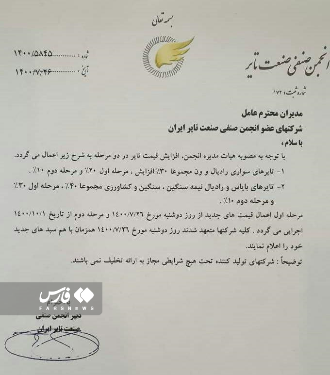 بر اساس نامه انجمن تایر به شرکتهای عضو این انجمن، قیمت تایرهای سواری و ون مجموعا ۳۰ درصد افزایش مییابد که این رشد قیمت در مرحله اول ۲۰ درصد و در مرحله دوم ۱۰ درصد خواهد بود.