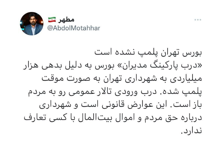 به گزارش خبرنگار شهری برگزیده های ایران، در پی برخی اطلاع رسانیهای اشتباه درباره پلمب ساختمان بورس توسط شهرداری تهران، عبدالمطهر محمدخانی، رئیس مرکز ارتباطات و امور بین الملل شهرداری تهران در صفحه شخصی خود در توئیتر اظهارداشت: بورس تهران پلمب نشده است. «درب پارکینگ مدیران» بورس به دلیل بدهی هزار میلیارد تومانی به شهرداری تهران به صورت موقت پلمب شده است.