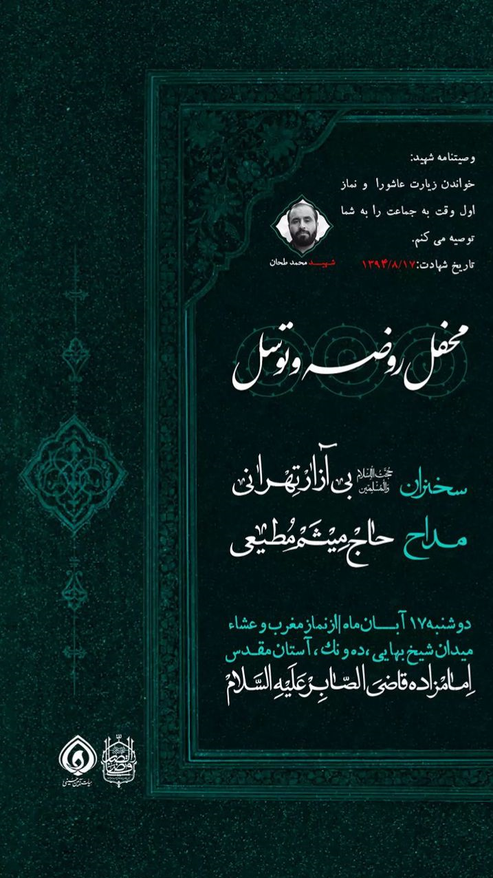 به گزارش خبرنگار حوزه مسجد و هیأت برگزیده های ایران، هیأت آئین حسینی محفل روضه و توسل شامگاه دوشنبه ۱۷ آبانماه به یاد شهید محمد طحان برگزار خواهد کرد.