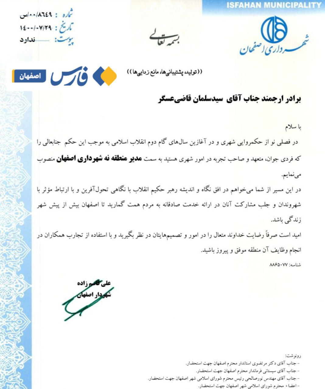 شهردار اصفهان همچنین در حکم دیگری سیدسلمان قاضیعسگر را به عنوان مدیر منطقه ۹ شهرداری اصفهان منصوب کرد.