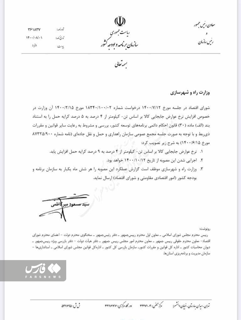 در نامه سازمان برنامه و بودجه آمده است: شورای اقتصاد در جلسه ۱۲ مهر ۱۴۰۰ درخواست شماره ۱۸۳۴۰/۱۰۰/۰۲ به تاریخ ۱۵ اردیبهشت ۱۴۰۰ وزارت راه و شهرسازی درباره افزایش نرخ عوارض جابهجایی کالا بر اساس تن کیلومتر از ۴ درصد به ۵ درصد کرایه حمل را به استناد بند الف ماده ۳۰ قانون احکام دائمی برنامههای توسعه کشور، بررسی و مشروط به رعایت سایر قوانین و مقررات ذیربط و با توجه به صورت جلسه مجمع عمومی سازمان راهداری و حمل و نقل جادهای (نامه شماره ۸۷۳۲۵/۹۰۰ تاریخ ۱۵ شهریور ۱۴۰۰ به شرح زیر تصویب کرد:
