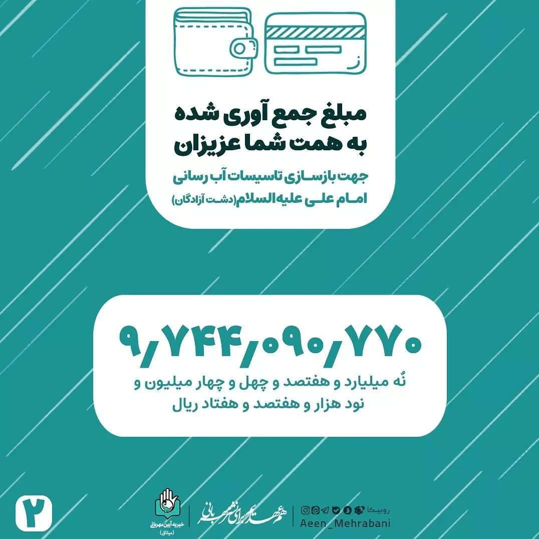 حال بعد از حدود سه ماه که روند پیگیریهای کار از آبفای استان و همچنین تهیه تجهیزات مورد نیاز زمان برد، حجتالاسلام محمد رستمی مدیرعامل موسسه آئین هنر حسینی و خیریه آئین مهربانی اعلام کرد: با کمک خیرین و مردم، مبلغ ۱ میلیارد تومان برای اصلاح تأسیسات آبرسانی امام علی علیهالسلام سوسنگرد که شامل خرید ۳ پمپ آب و تجهیزات جانبی آن بود، فراهم شد. عملیات نصب و تجهیز این تاسیسات از روز ۲۴ مهرماه آغاز شده است و ان شاء الله طی روزهای آتی به بهرهبرداری خواهد رسید.