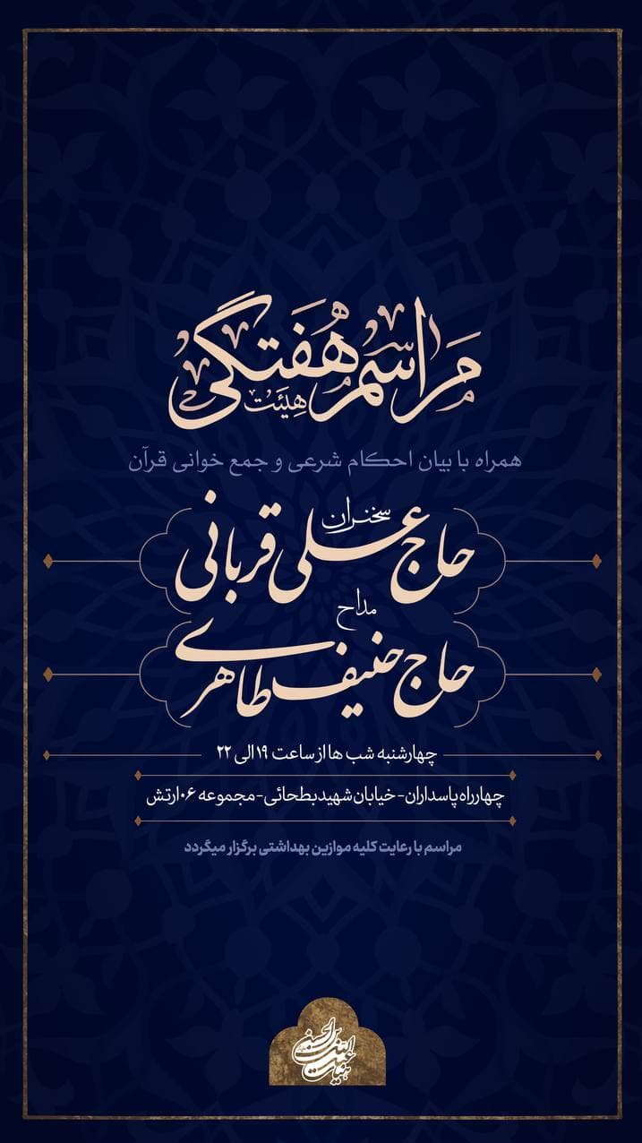 به گزارش خبرنگار حوزه مسجد و هیأت برگزیده های ایران، جلسات هفتگی هیأت عبدالله بن الحسن(ع) با مداحی حنیف طاهری از این هفته چهارشنبه ۵ آبانماه از سرگرفته میشود.