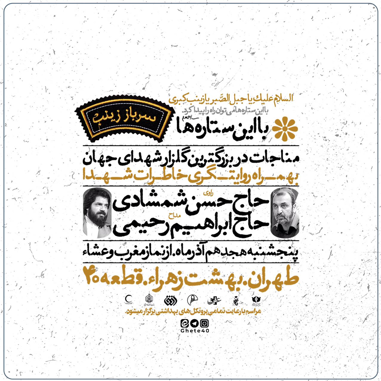 این برنامه که هر هفته در قطعه ۴۰ گلزار شهدای بهشت زهرا با حضور عموم مردم برگزار میشود، این هفته میزبان حسن شمشادی، راوی و خبرنگار جبهه مقاومت است.در مراسم این هفته، ابراهیم رحیمی به مناجاتخوانی خواهد پرداخت.