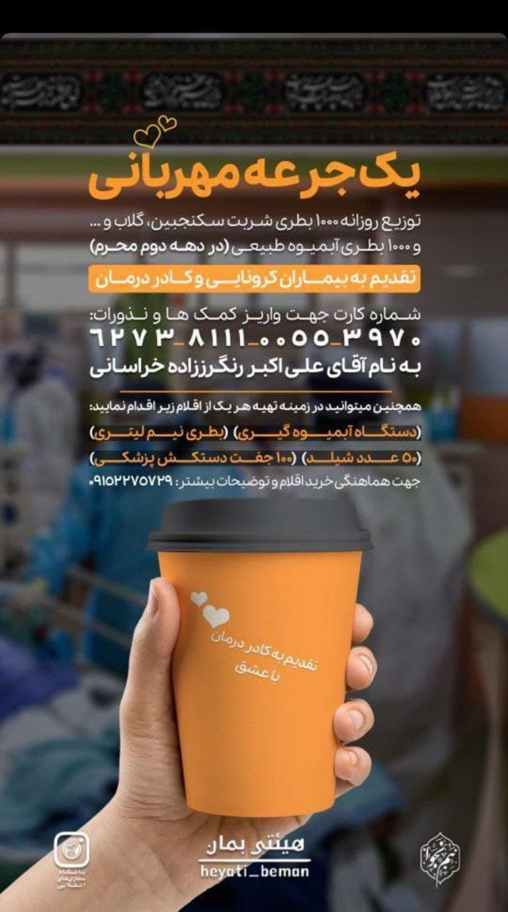شریف با دعوت از اقشار مختلف مردم برای مشارکت در پویش «یک جرعه مهربانی» تأکید کرد: علاقهمندان به کمک و همراهی با این پویش میتوانند علاوه بر واریز نذورات و کمکهای نقدی به شماره کارت ۶۲۷۳۸۱۱۱۰۰۵۵۳۹۷۰ به نام علیاکبر رنگرززاده خراسانی درزمینهٔ تهیه دستگاه آبمیوه گیری، بطری نیم لیتری، ۵۰ عدد شیلد و ۱۰۰ جفت دستکش پزشکی مشارکت کنند.