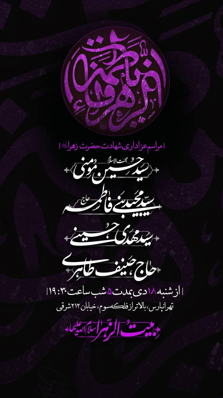 این مراسم از امشب شنبه ۱۸ دیماه به مدت ۵ شب از ساعت ۱۹:۳۰ در بیتالزهرا(س) واقع در تهرانپارس، بالاتر از فلکه سوم، خیابان ۲۱۲ شرقی برگزار میشود.